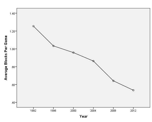 Sadly, total rebounds per game lacked a significant result as well. The averages were: 1992 (8.37), 1996 (7.42), 2000 (6.79), 2004 (7.27), 2008 (6.90), and 2012 (6.56).