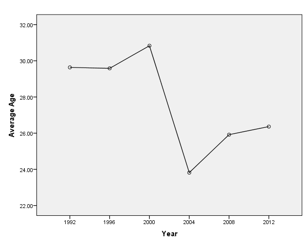 Once again (thanks to the scale) there appears to be an overall trend of a small line-up, but there was neither a trend nor group differences to support that hypothesis. The means would suggest incremental differences (hence the lack of significance): 1992 (79.73), 1996 (79.75), 2000 (78.83), 2004 (78.91), 2008 (78.50), and 2012 (78.46).